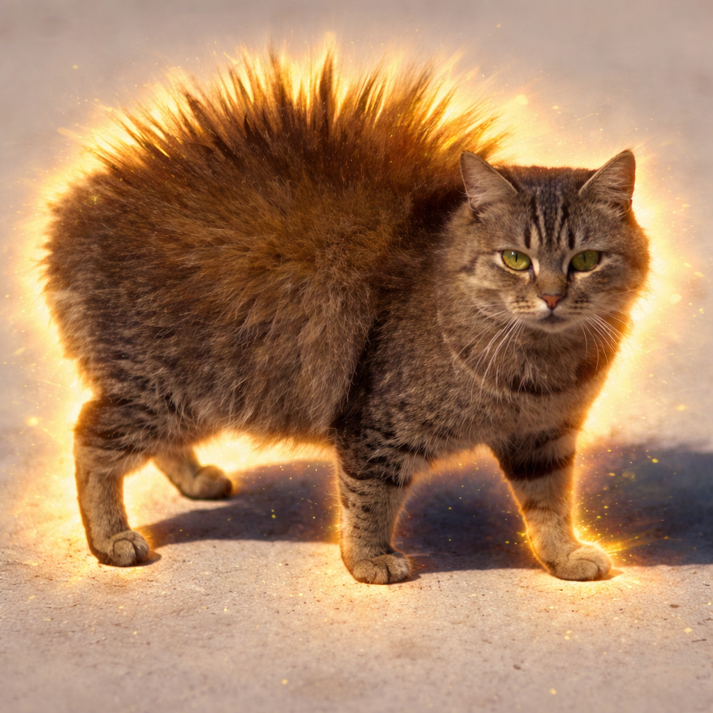 The shock sent him flying. His fur stood up like a hedgehog. He looked at the camera like nothing happened.
